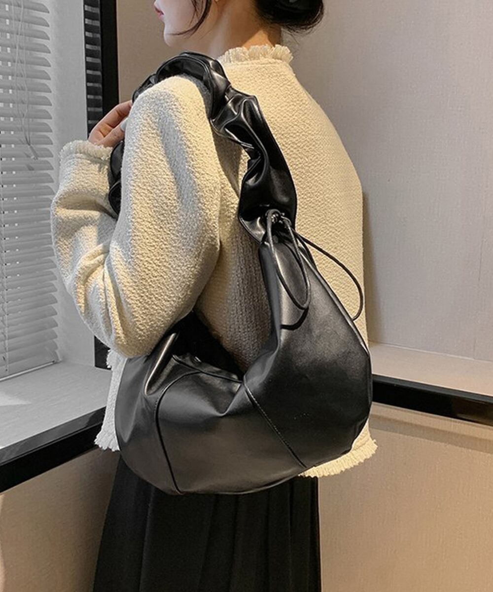 ギャザーのディテールがアクセントとなり、おしゃれな印象を与えるトートバッグ